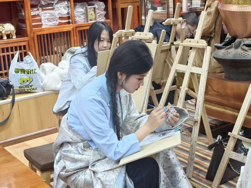 在非遗体验中心,很多通过小红书等社交媒体专门到此的游客络绎不绝。网络达人们现场感受了藏香的制作,并观看了普通游客进行唐卡绘制。体验中心负责人恩主介绍:“我们这里,已经成为世界看迪庆,了解藏乡文化的一个中药窗口。通过提供大量免费项目,吸引外来游客亲自感受香格里拉的美丽。”